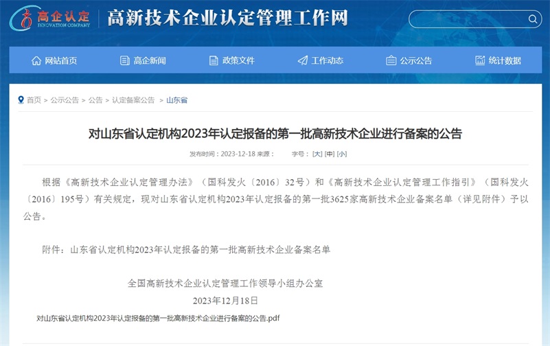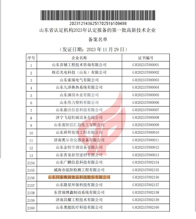 近日,全國高新技術(shù)企業(yè)認定管理工作領(lǐng)導(dǎo)小組辦公室公示了山東省認定機構(gòu)2023年認定報備的第一批高新技術(shù)企業(yè)名單,山東同泰維潤食品科技股份有限公司再次通過認定,被授予“國家高新技術(shù)企業(yè)”稱號。