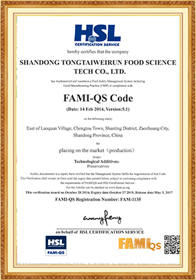 公司是“國(guó)家高新技術(shù)企業(yè)”、“國(guó)家知識(shí)產(chǎn)權(quán)優(yōu)勢(shì)企業(yè)”、“中國(guó)產(chǎn)品質(zhì)量放心達(dá)標(biāo)企業(yè)”、工信部“中國(guó)制造2025 重大項(xiàng)目庫(kù)企業(yè)”、 “山東省瞪羚企業(yè)”、山東省首批“隱形冠軍企業(yè)”、“山東省知名品牌”企業(yè)、“山東省兩化融合試點(diǎn)示范企業(yè)”、“省級(jí)產(chǎn)業(yè)互聯(lián)網(wǎng)平臺(tái)示范企業(yè)”、“山東省專精特新企業(yè)”。共獲得 10多個(gè)創(chuàng)新平臺(tái)(“山東省博士創(chuàng)新基地”、“省級(jí)企業(yè)技術(shù)中心”、“省級(jí)一企一技術(shù)研發(fā)中心”、“省級(jí)工程實(shí)驗(yàn)室”、“棗莊市復(fù)配飼料添加劑技術(shù)創(chuàng)新中心”、“棗莊市食品防腐劑工程試驗(yàn)室”、“棗莊市食品防腐劑工程技術(shù)研究中心”、“棗莊市科技協(xié)同創(chuàng)新中心”)。擁有ISO9001質(zhì)量管理體系、ISO22000食品安全管理體系、法國(guó)國(guó)際檢驗(yàn)局(BV)、猶太KOSHER、清真halal、歐盟FAMI-QS、美國(guó)FDA等七個(gè)體系認(rèn)證,真正實(shí)現(xiàn)了中國(guó)和歐盟雙認(rèn)證。