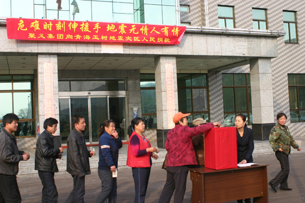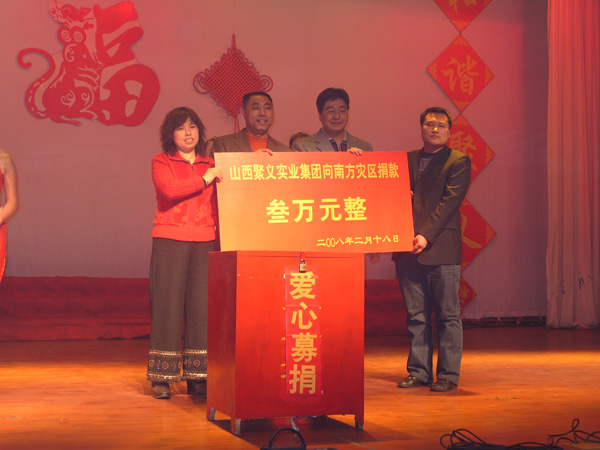 聚義集團(tuán)歷年來(lái)多次為湖南雪災(zāi)、四川震災(zāi)、云南旱災(zāi)、青海玉樹(shù)震災(zāi)捐款捐資,救助累計(jì)百余次達(dá)620多萬(wàn)元。